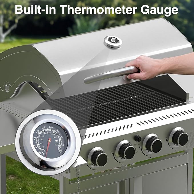- 【Versatile Outdoor Cooking】: This 4-burner propane gas grill is perfect for patios, gardens, and camping trips. It lets you grill, sear and heat sauces all at once, meeting diverse cooking needs and delivering a complete outdoor culinary experience.
