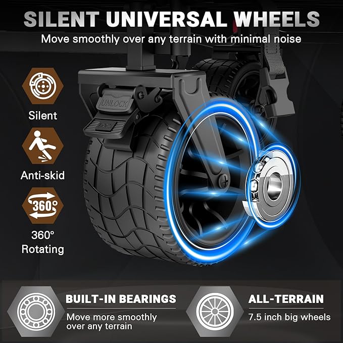 - [All-Terrain 360°Silent Swivel Wheels]Glide smoothly over sand, gravel, grass, or uneven pavement with premium noiseless wheels. The 360-degree rotation provides effortless maneuverability, while the rugged tread design ensures stability on any surface