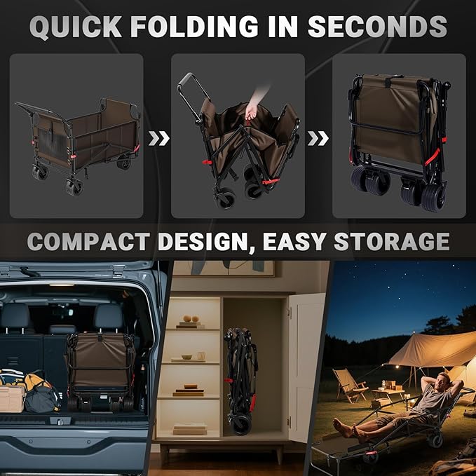 LEVELEVE Heavy Duty Folding Wagon - 2-in-1 Collapsible Cart, 650lb Capacity, All-Terrain Wheels w/Brakes & Side Pockets (Brown)