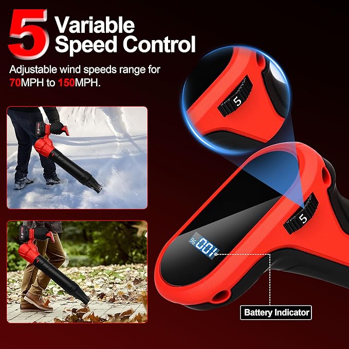 - 【5 Speed Modes】: The cordless blower is equipped with 5 different wind intensities, and you can find the appropriate gear to clean different areas according to different cleaning needs.A must-have for year-round yard maintenance and thorough cleanups.