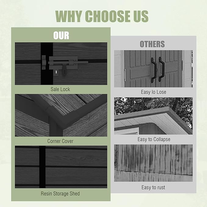 - Lockable Door :The garden shed's metal lock can lock the door to prevent the loss of items in the storage shed. The air vents allow air to circulate inside the shed. The transparent window enables you to see the stored items inside, making it more convenient to take them.