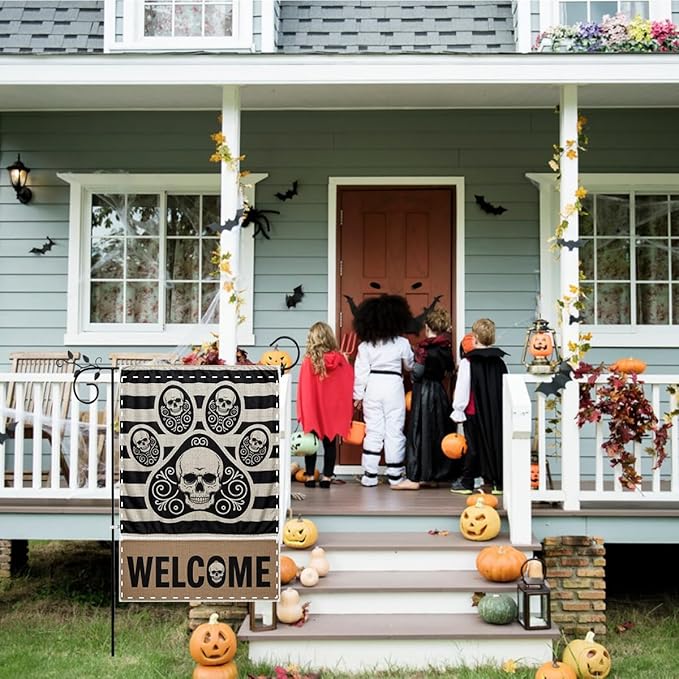 Fokongna Halloween Welcome Garden Flag, Dog Paw Print Skeleton Halloween Decor Garden Flag, 12x18 Inch Burlap Vertical Double Sided Flags, for Home Yard Outside Decorations