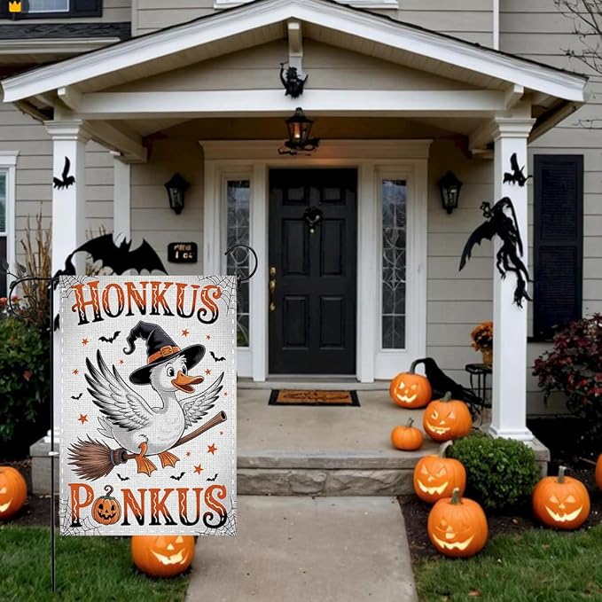 Fokongna Witch Goose Halloween Garden Flag, Interesting Happy Halloween Decor, 12x18 Inch Burlap Vertical Double Sided Flags, for Home Yard Outside Decorations