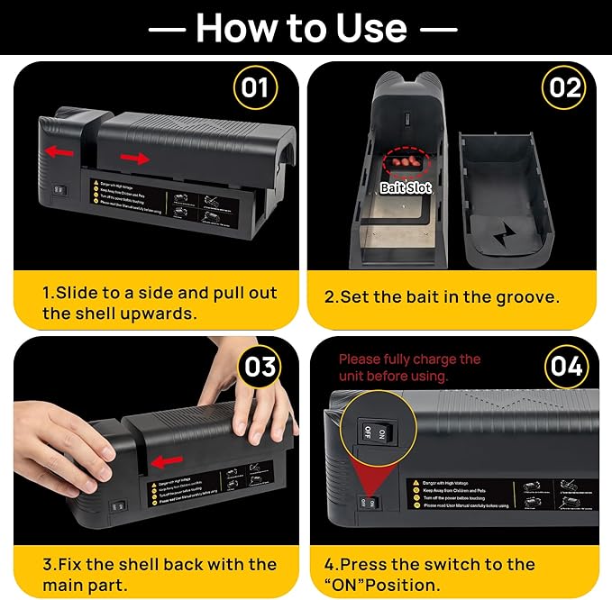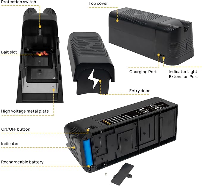 - Easy-to-Use Design: Using this rat trap is super easy: put bait (such as peanuts, bread, or ham sausage) in the designated slot, close the cover, press the ON/OFF button, and place it near walls or corners where rats are active.