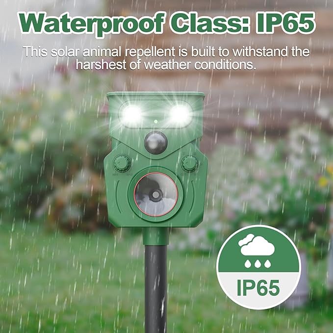 - Durable and Waterproof: With an IP65 waterproof grade, the animal repeller withstands various outdoor weather conditions, suitable for gardens, farms, and other outdoor spaces.