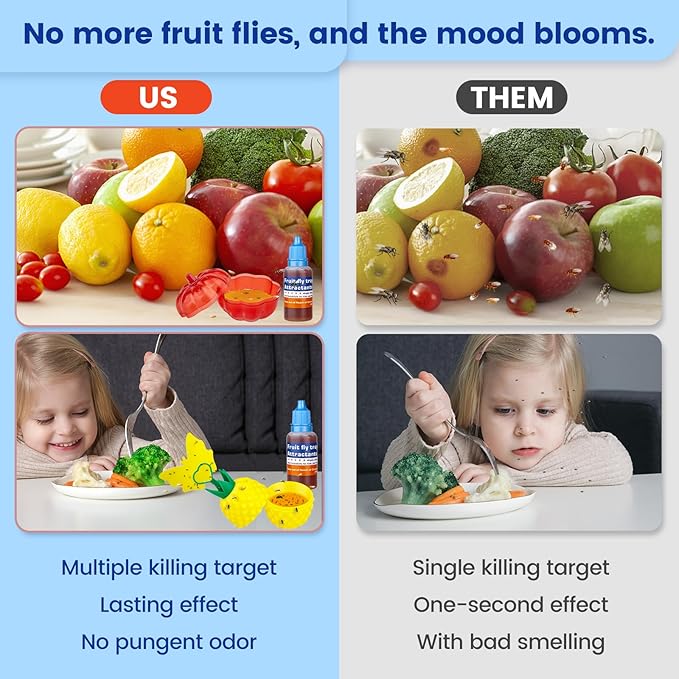 - Efficient Fruit Fly Killer Indoor Traps:Our fruit fly trap bait refill amazingly attracts,traps and kills fruit flies.It is recommended to use with fruit fly trap for better effect. The fruit flies killer indoor emits a scent that attracts fruit flies,sending them into the trap's entry hole where they cannot escape and eventually drown.