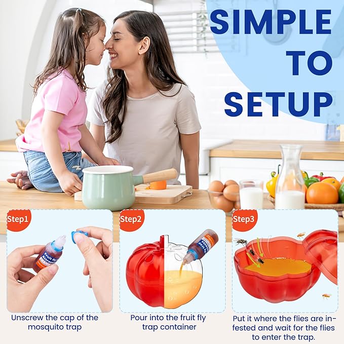 - Easy-to-Use Indoor Gnat Trap:Ready to use right out of the box. You just open the refill liquid,pour it into the fruit fly trap,and then place the fly trap in the place where the fruit flies are,and the fruit flies will be attracted from above.Once a fruit fly is in a fruit fly trap,it cannot escape breeding.Pests are attracted to smells,killing them is easy!It is recommended to use it with fruit fly traps for better results!