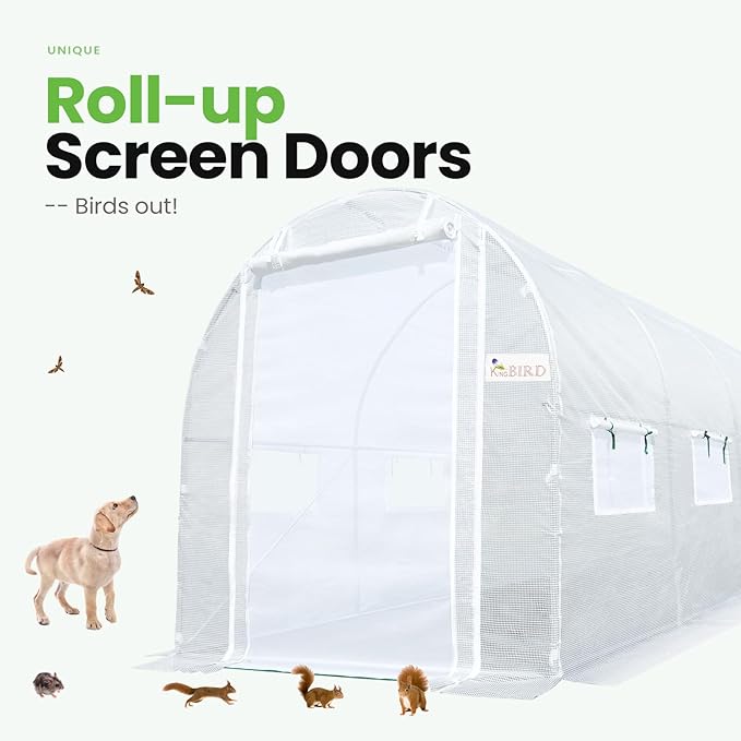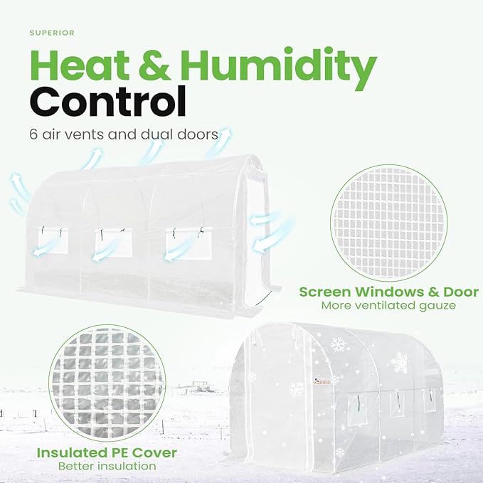 - [Temperature & Humidity Management]--Featuring 6 roll-up screen windows plus 2 door-netting, it facilitates temperature and humidity control. It increases temperature promoting early spring plant growth, enhances ventilation on hot summer days, and retains warmth during the winter. It keeps plants from pouring rain, winds, and snow.