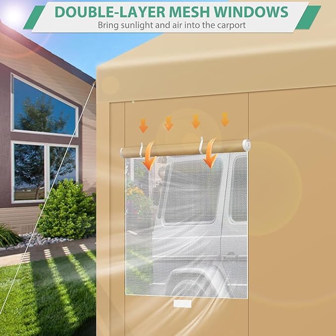- 【Good Ventilation】 Our portable garage is equipped with four roller shutter mesh windows and two zippered doors on two side walls, which enhance airflow, reduce moisture accumulation, and create a comfortable internal environment.