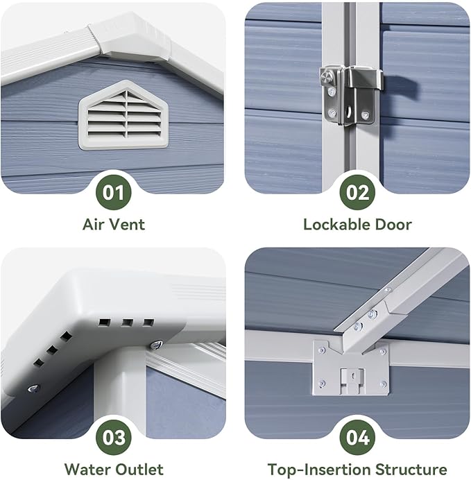 - 【Installation and delivery】 This plastic storage shed has been optimized many times to achieve a simpler installation with fewer screws, which takes only 30-40 minutes for 2 people to install.