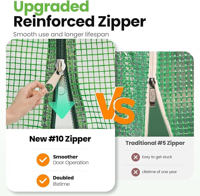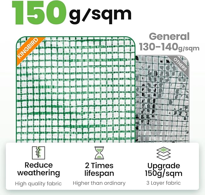 - [UVI 6 Protected Cover]--Waterproof 150g/sqm PE grid cover is UV Index 6 protected, protects your plants from excess rays, which doubles the service life: Compared to other greenhouse(UVI 1-3) that only lasts for 1-6 months, the KING-cover lasts for over years. The reinforced odorless PE covering material provides safe work zone. The cover fits the frame closely, enhancing warmth and wind resistance.