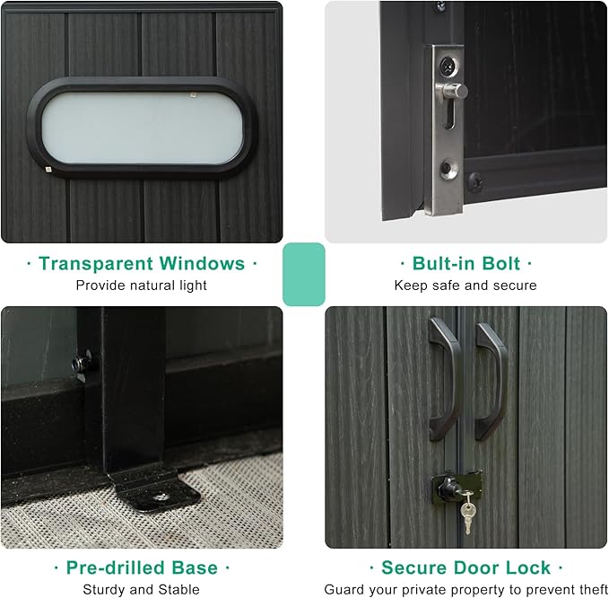 - Lockable Security & Stability - Domi plastic shed comes with a lockable door for security, plus thickened steel frame and pre-drilled anchoring points that provides exceptional stability.
