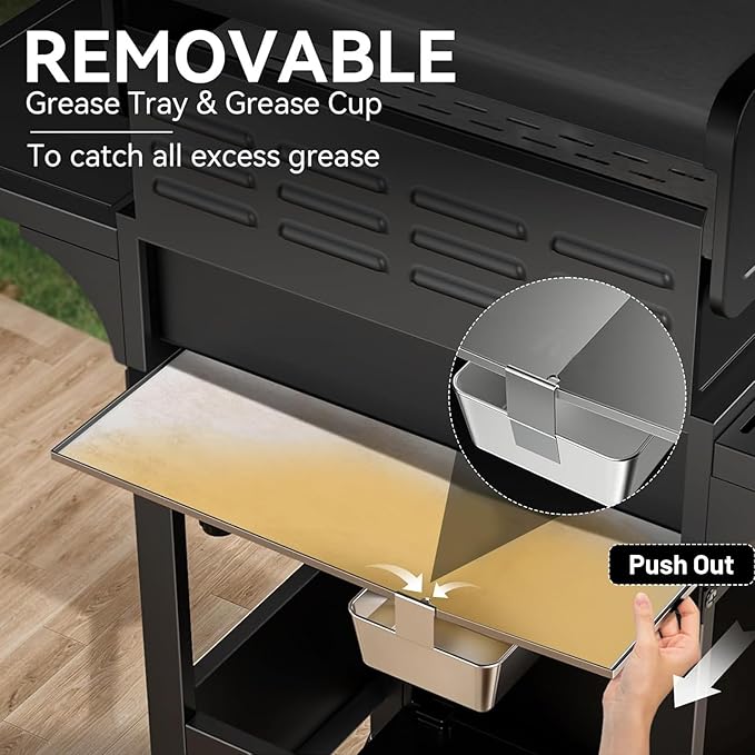 - 【Easy Cleanup And Maintenance】The full-size grease tray slides out smoothly, making it a breeze to deal with grease and drippings while you're grilling. Plus, the handy cup lets you easily get rid of the collected grease, keeping the post-grill cleanup hassle-free. This design also ensures your food tastes its best by preventing excessive grease from affecting the flavor