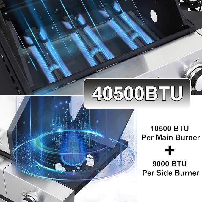 - High-powered Burners: This stainless steel gas grill has 3 main burners (10,500 BTU each) and a side burner (9,000 BTU). 4 burners deliver a total of 40,500 BTU cooking power.