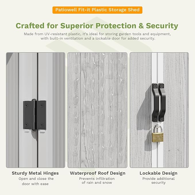 - Durable and Stable Construction: Thickened resin panels resist rain, UV rays and summer heat. Reinforced and flat roof to place stacked stacked pots/planters; floor withstands heavy toolboxes without buckling.