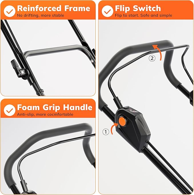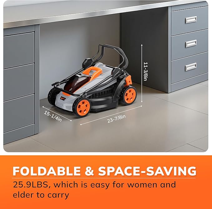 - COMFORTABLE HANDLING: Thickened ergonomic grips reduce strain. Dual-action start requires a simultaneous button press and lever pull to prevent accidents. Folds to 11.4 inches in height for shed storage. Lightweight design at 25 pounds, The battery lawn mower is ideal for women and elderly