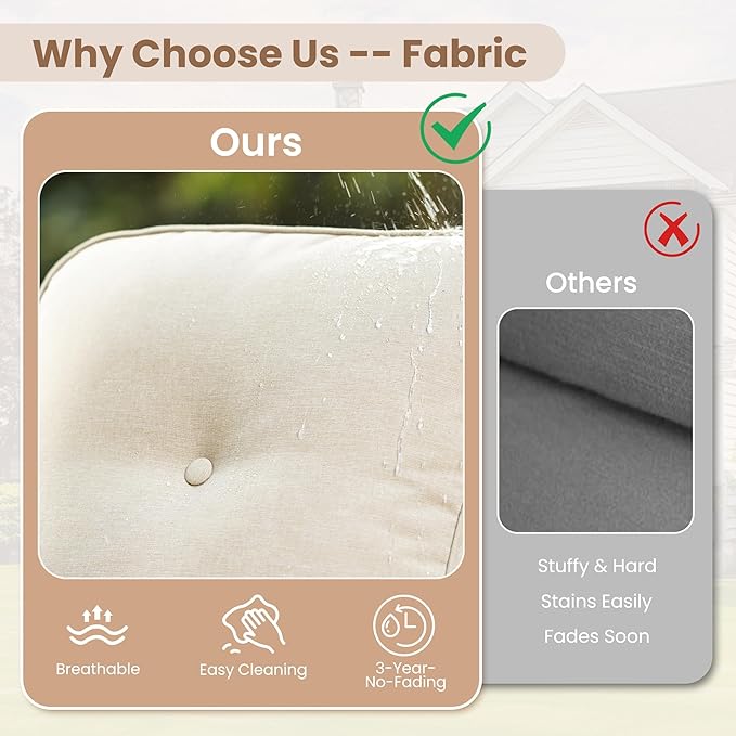 - Texture Woven Fabric: Cushions are covered by yarn dyed woven fabric,the yarns are dyed and UV treated before woven into fabric for out door fading resistant and water repellent. Looks and touches with high-end woven texture. No more worry about getting cheaply made thin print fabric. Detachable & washable
