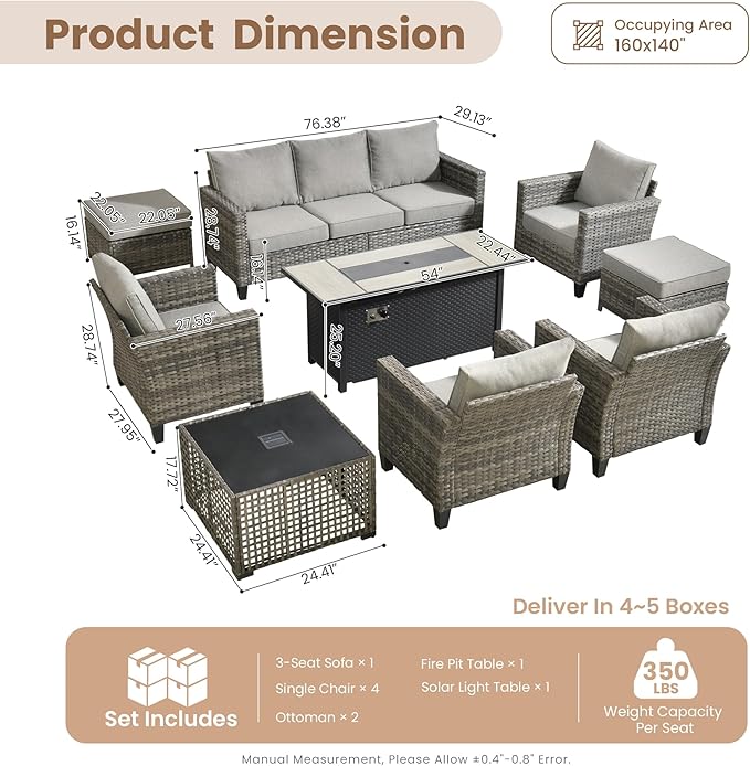 HOOOWOOO Outdoor Patio Furniture Set,9 Pieces Wicker Conversation Set,All Weather Couch Set with Fire Pit Solar Light Table Chairs Ottoman 9 Seaters for Out Door Yard(Charcoal Gray)