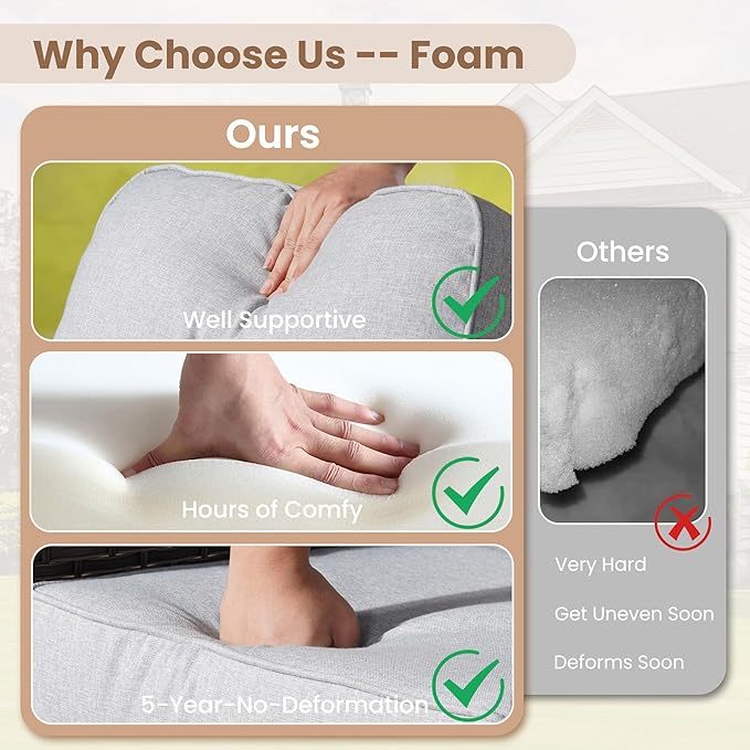 - Texture Woven Fabric: Cushions are covered by yarn dyed woven fabric,the yarns are dyed and UV treated before woven into fabric for out door fading resistant and water repellent. Looks and touches with high-end woven texture. No more worry about getting cheaply made thin print fabric. Detachable & washable