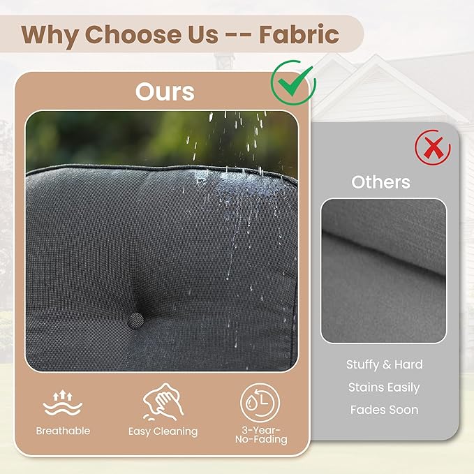 - Texture Woven Fabric: Cushions are covered by yarn dyed woven fabric,the yarns are dyed and UV treated before woven into fabric for out door fading resistant and water repellent. Looks and touches with high-end woven texture. No more worry about getting cheaply made thin print fabric. Detachable & washable
