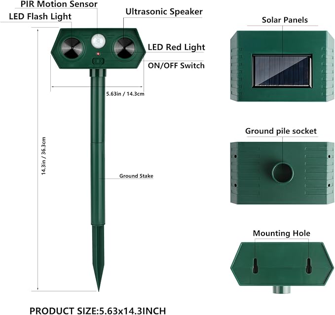 - Safe & Human Design - You can simply insert the animal repeller into the ground or hang up where there is plenty of sun light and switch it on, which is perfect for yard, patio, garage, attics, porches, boats, garden, farm, pond, etc. Besides, it is mini enough for you to take it to outdoor, such as camping.