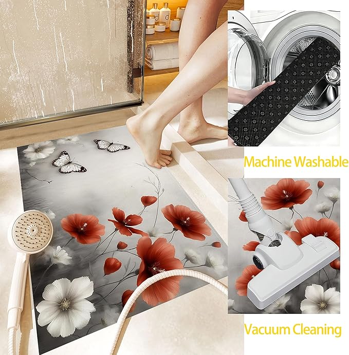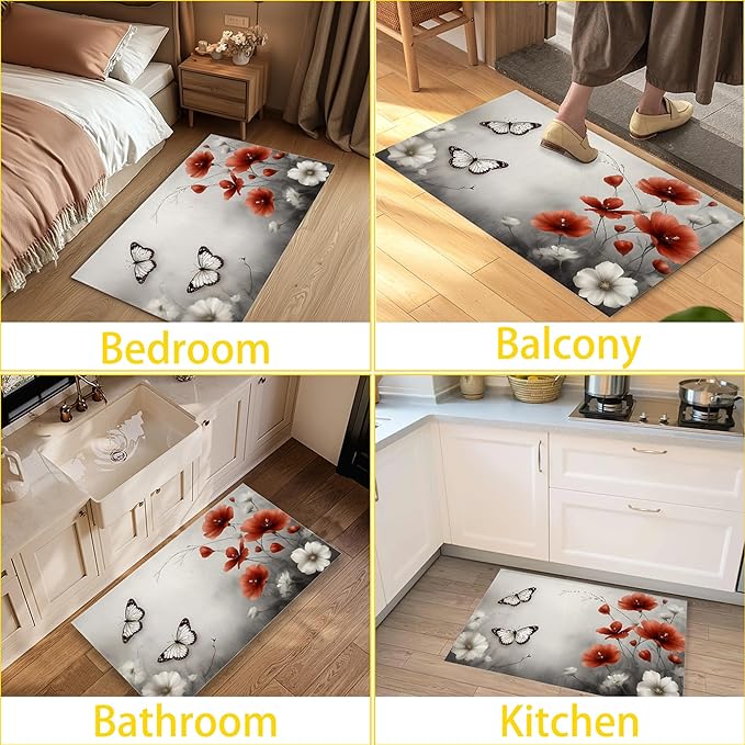 Red Poppy Flower Welcome Mat Indoor,Vintage Butterfly Floral Front Door Mat,Non-Slip Entryway Rug, Low Profile Felt Indoor Doormat for Back Door Porch Patio Entrance,30 x 17 Inch