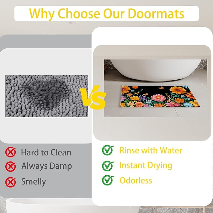 - Versatile Use: The doormat is perfect for indoor outdoor entrance,porch,hallways! And the doormat's unique design and pattern impart a pleasing aesthetic touch.Whether in the bathroom, kitchen, bedroom, laundry room, living room, garage, office, or courtyard, you can use it to add a touch of charm. It's a fantastic idea for gifting to friends and neighbors as a warming house gift.