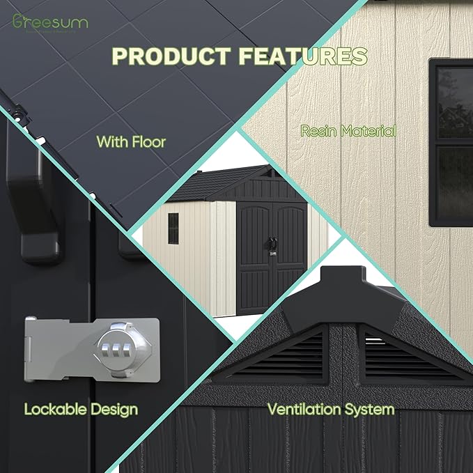Greesum 8×10 FT Plastic Outdoor Storage Shed with Floor, Resin Sheds with Lockable Door and Window, Weather Resistant Organization for Garden, Lawn, Pool Supplies, Beige