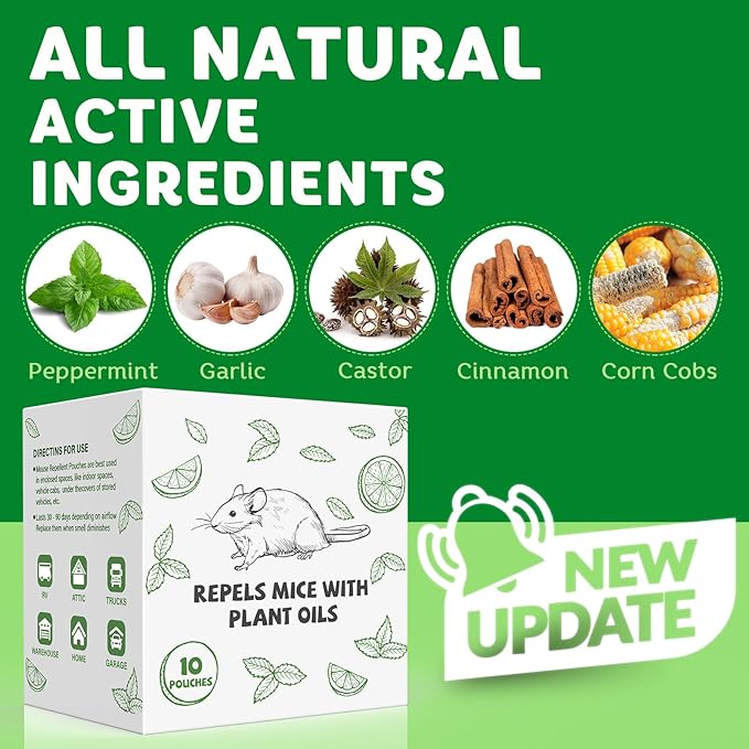 - 【Easy to Use】Simply remove the sealed plastic packaging, place the peppermint oil for mice into the included mesh bag, and place it in areas where rodents are often found, such as kitchen corners, car engines, barns, etc. The unpleasant smell will keep rodents away