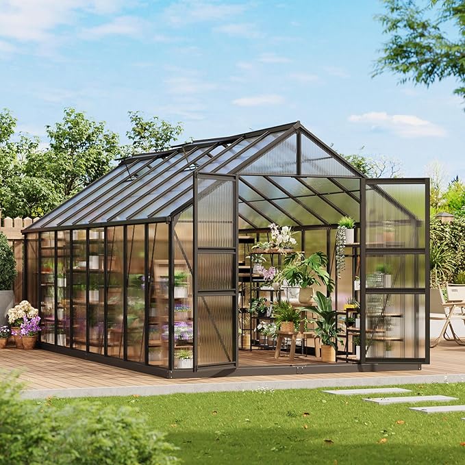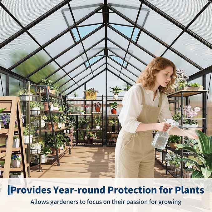 - Resilient Construction to Withstand Tough Weather:Built to endure challenging conditions, this greenhouse features 720g/m² polycarbonate panels paired with a solid aluminum steel frame. This combination ensures stability and protection even during heavy rain and strong winds, keeping your plants safe and thriving for the long term