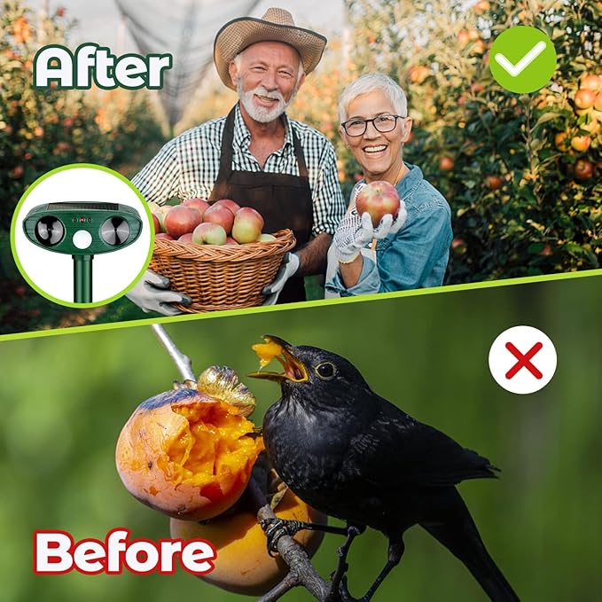 - 【Easy To Install & Carry】 - You can simply insert the animal repeller into the ground or hang it up where there is abundant sunlight and switch it on. It is perfect for yards, patios, garages, attics, porches, boats, gardens, farms, ponds, etc. Besides, it is small enough for you to take it outdoors, such as when camping.
