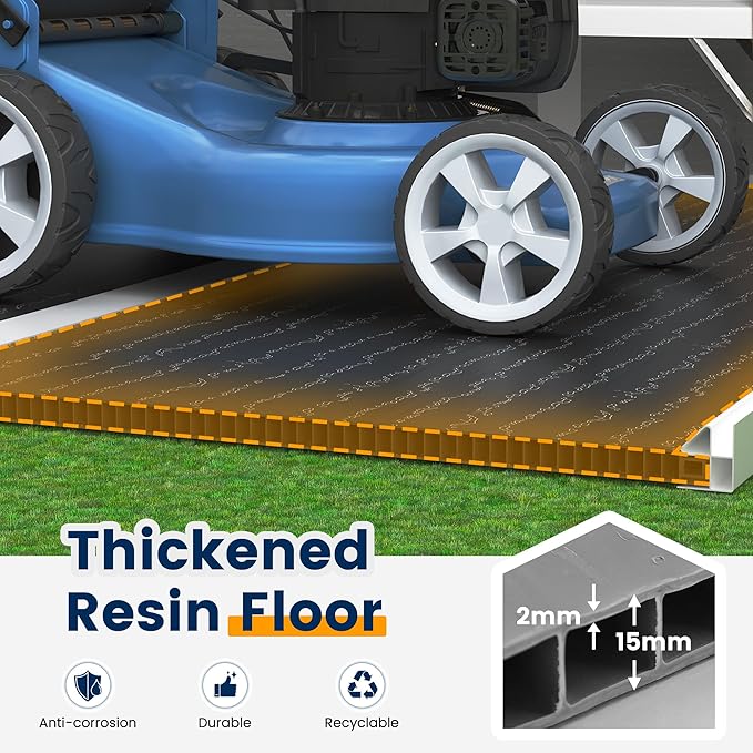 - HIGH-QUALITY MATERIAL: This outdoor storage shed is made of 12mm high-quality polypropylene resin plastic. Our resin storage shed has good characteristics such as recyclability, corrosion resistance, waterproofing, and rust prevention