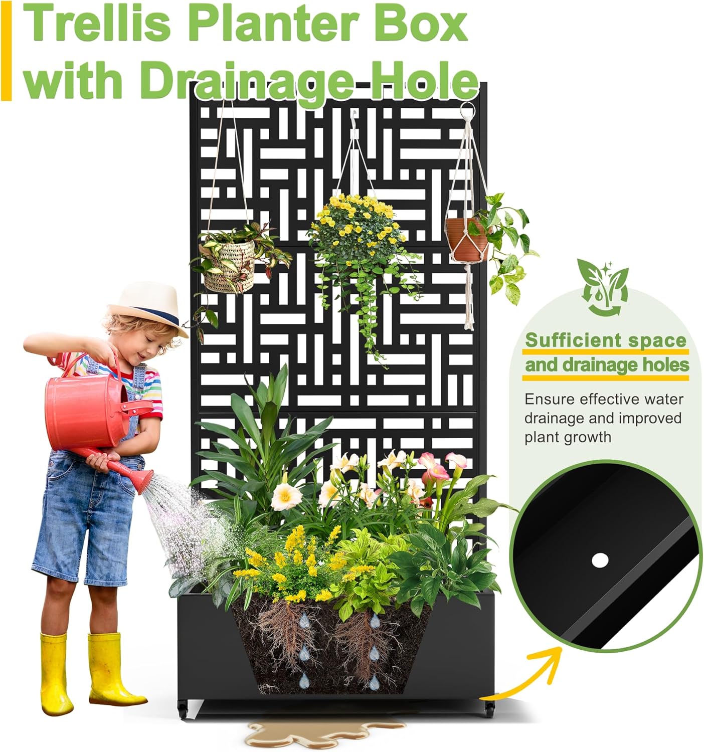 FENCY Metal Raised Garden Bed with Wheels and Trellis,73"x35"x16" Planter Box for Climbing Plants, Vegetables & Vines, Features Privacy Screen and Drainage Holes (Black-Geometric Lattice)