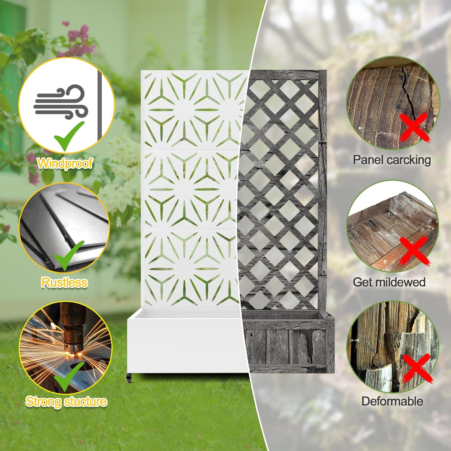 FENCY Metal Raised Garden Bed with Wheels and Trellis,73"x47"x16" Planter Box for Climbing Plants, Vegetables & Vines, Features Privacy Screen and Drainage Holes (White-Star)