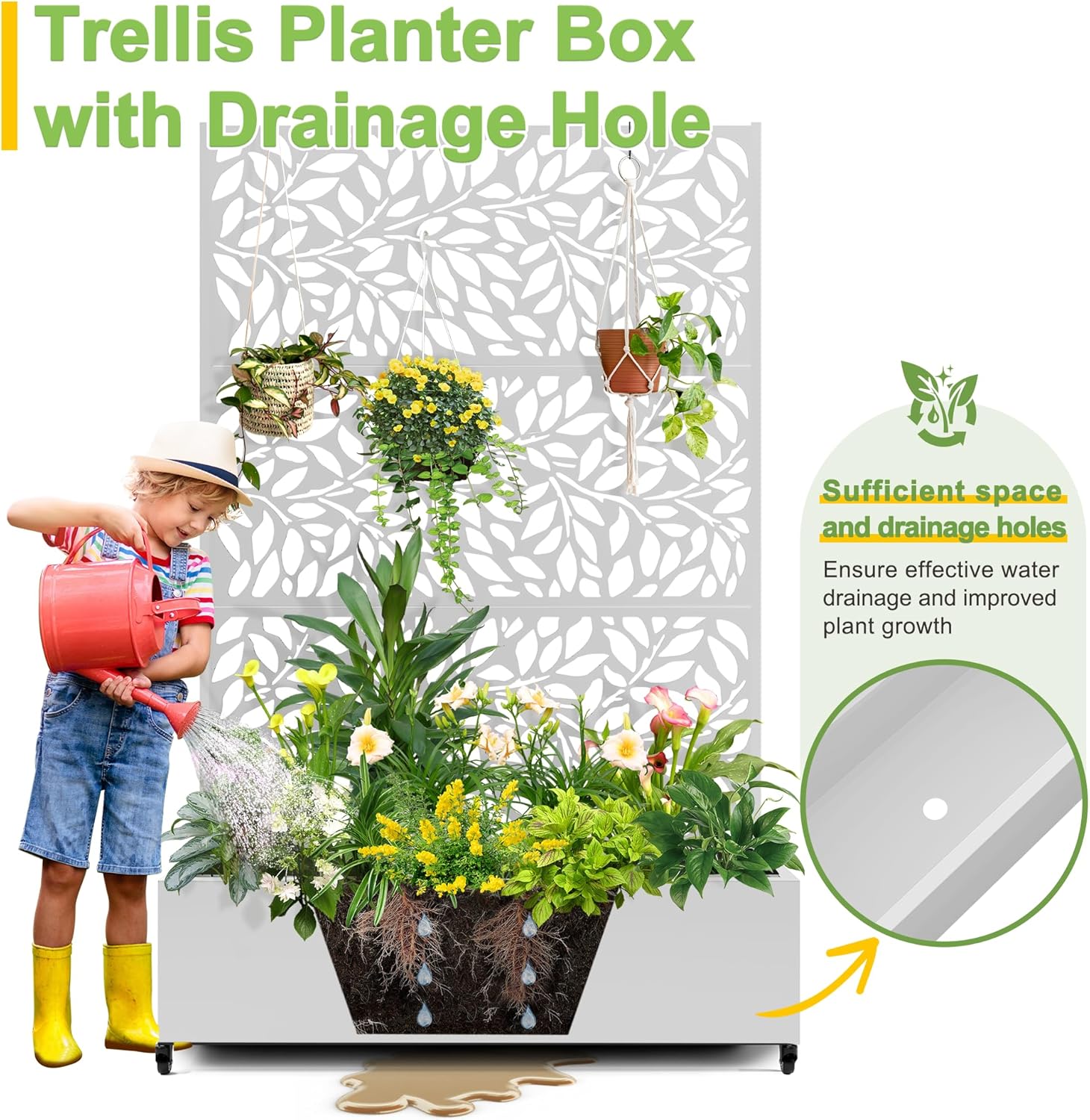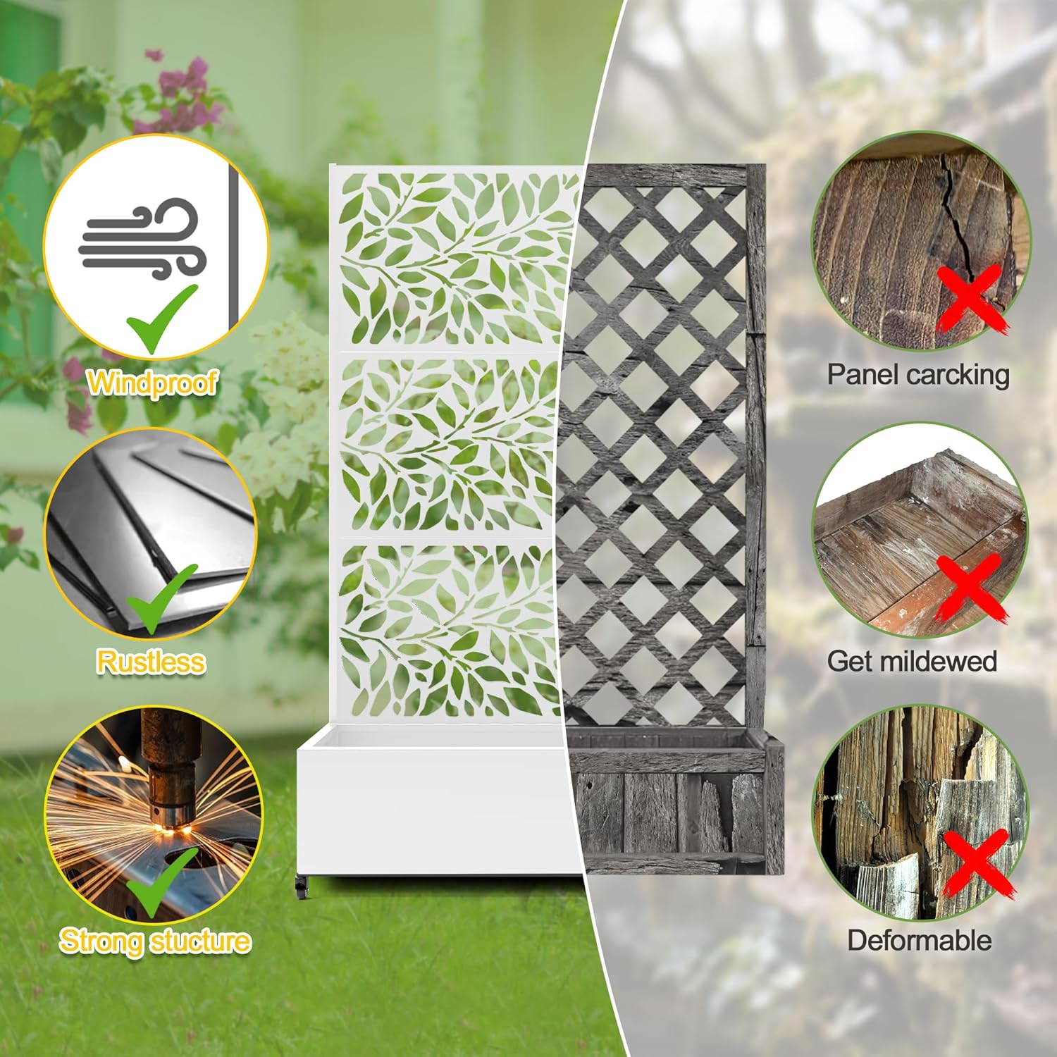 FENCY Metal Raised Garden Bed with Wheels and Trellis,73"x47"x16" Planter Box for Climbing Plants, Vegetables & Vines, Features Privacy Screen and Drainage Holes (White-Leaf-2)