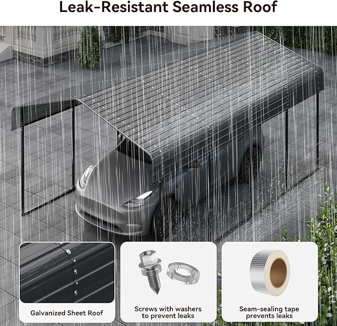 - Sturdy Structure: Made from 1.6" steel tubes with a powder-coated finish, this carport is not only sturdy and built to handle heavy loads, but also effectively resists UV rays, rain, and humidity. It is anti-rust, anti-corrosion, and scratch-resistant, maintaining its aesthetics and stability over time.