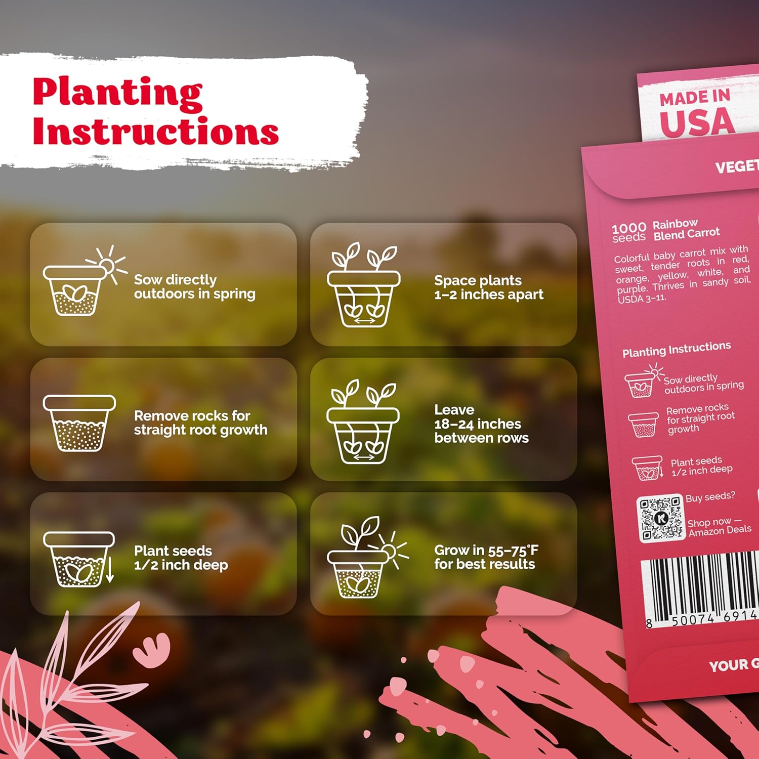 - Vibrant Colors: Red, purple, white, yellow & orange rainbow carrots; 90%+ germination rate. Rainbow carrot seeds for planting thrive in USDA 3‑11, ideal for growing organic carrots fresh for juicing & fresh snacks.