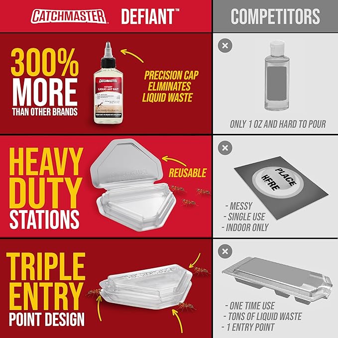 - DEFIANT ANT CONTROL SYSTEM: DEFIANT Ant Control System is the only ant control solution that adapts to your home and your needs. Use the reusable ant traps indoor or outdoor, anywhere ants invade. The triple-entry design is optimized for maximum ant interception from multiple directions.