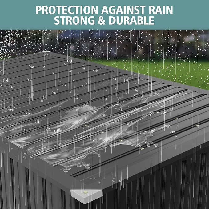 - Sturdy & Durable: Built from galvanized steel with a black powder-coat finish, this storage shed is strong and durable, suitable for long-term use. It can withstand harsh weather like rain, wind, and snow. The use of color-coated sheets guarantees that this product stays corrosion-resistant. It's perfect for outdoor settings such as around pools, in gardens, and on lawns