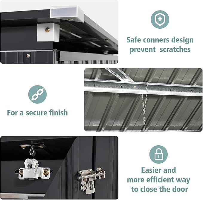 - Practical Design: The metal storage shed(trash bin shed) comes with a door bolt, which significantly boosts the security of your items and helps avoid loss. Its appealing look enables it to integrate effortlessly into your garden, backyard, patio, and other outdoor spaces