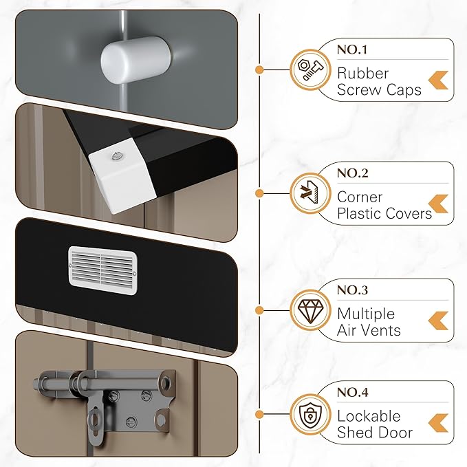 - Sturdy Shelter: The metal shed is made of galvanised steel with higher tensile strength and hardness, and the structure of the shed is in accordance with the mechanics, which ensures the solidity and stability of the shed. We have also optimised the safety of the shed. We provide plastic protective caps for each screw to prevent anyone from being injured by the exposed screws.