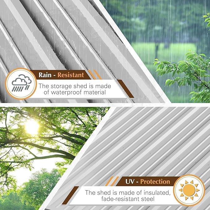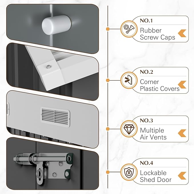 - Sturdy Shelter: The metal shed is made of galvanised steel with higher tensile strength and hardness, and the structure of the shed is in accordance with the mechanics, which ensures the solidity and stability of the shed. We have also optimised the safety of the shed. We provide plastic protective caps for each screw to prevent anyone from being injured by the exposed screws.
