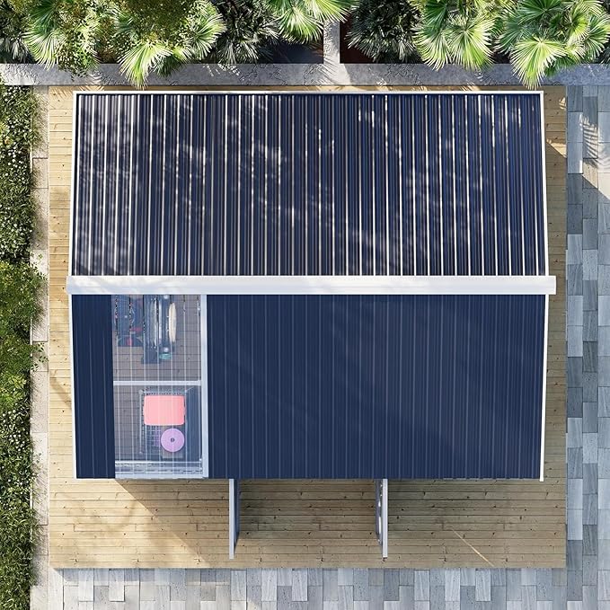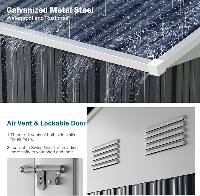 - 【Special Reinforced Frame】Storage shed not only adds 3 aluminum beams on the top but also a circle of aluminum support rods on the side, forming a wrapped reinforced frame as a whole. This design provides enhanced stability to withstand strong winds. Meanwhile, the galvanized & thickened metal panels ensure greater durability and corrosion resistance.
