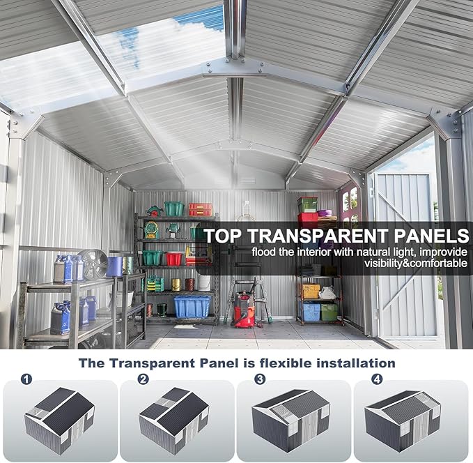 - 【Thoughtful Designs】Metal shed adds 2 transparent roof panels and 2 large windows, will flood the interior with more natural light, improve visibility and air circulation, make you feel comfortable when inside.