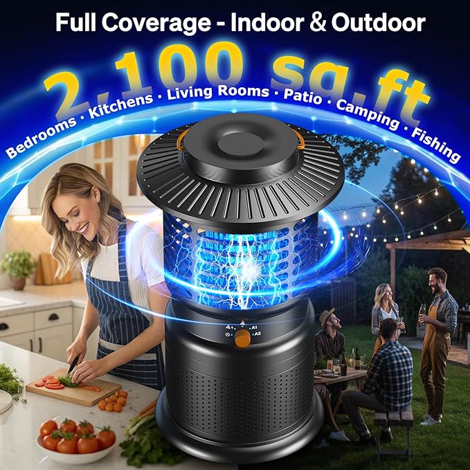 - DOUBLE TROUBLE – ZAP + SUCTION! The GTERT 2-in-1 bug zapper combines a high-voltage electric grid with a strong suction fan, eliminating mosquitoes, flies, and gnats in seconds. With 2100 sq.ft coverage, it guards your patio, living room, or backyard with ease. Why settle for itchy bites when you can enjoy calm, bite-free nights like a champ?