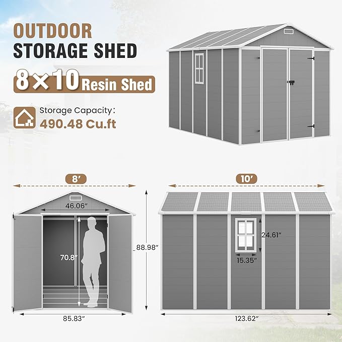 - [8'x10' RESIN OUTDOOR STORAGE SHED]: Product dimension-Roof: 90.3"(L)x128.3"(W); Base: 85.8"(L)x 123.6"(W); Hight 88.9"(H). VONZOY Resin Shed is available in variety sizes for multipurpose use, perfect for outdoor backyard, garden, patio, utility room. The plastic shed can also be used as a pet house to provide a warm and safe room for your pet.