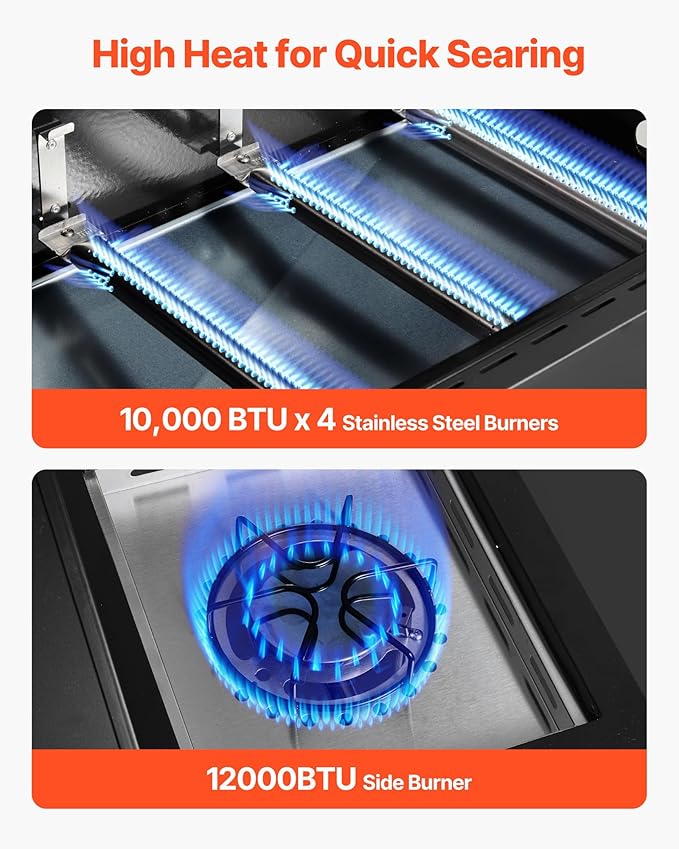- High-Efficiency Heating: This freestanding propane gas grill runs on a gas cylinder and includes three stainless steel burners (each outputting 10,000 BTUs) plus a 10,000 BTU side burner, delivering a total of 52,000 BTUs of strong heat. It ensures quick, even heating for searing meat or fast-cooking vegetables, keeping large meals moving efficiently