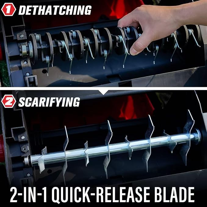 - [Quick-Switch 2-in-1 Blades]:Use the dethatcher to clear thatch and moss or switch to scarifying to encourage deeper root growth and better soil health. This versatile tool offers flexibility for different lawn care needs.