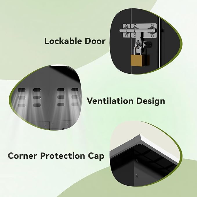 - Lockable Door and Vents:The lockable door provides security,keeps your tools away from being stolen,and avoids small animals from entering accidently;Two Top Vents for Better Airflow,Keeping the Space Cool and Odor-Free