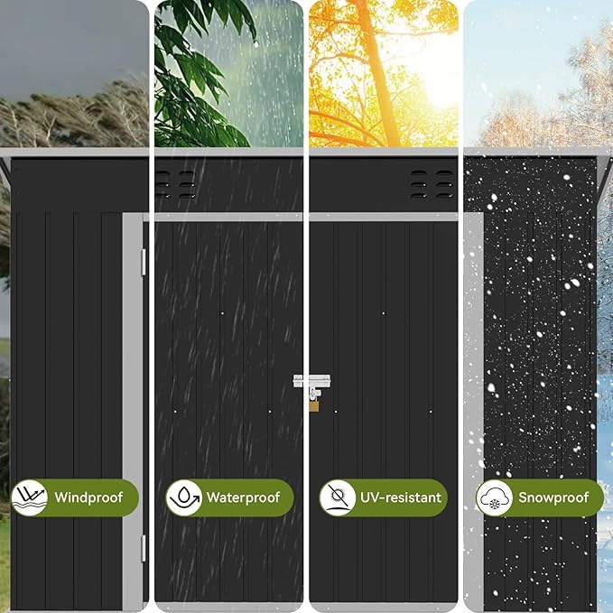 - Waterproof Tool Shed:The sloping roof design of this storage outdoor shed maximizes space utilization;effectively direct rainwater away from the structure to prevents the leakage,Don't worry about your items getting wet